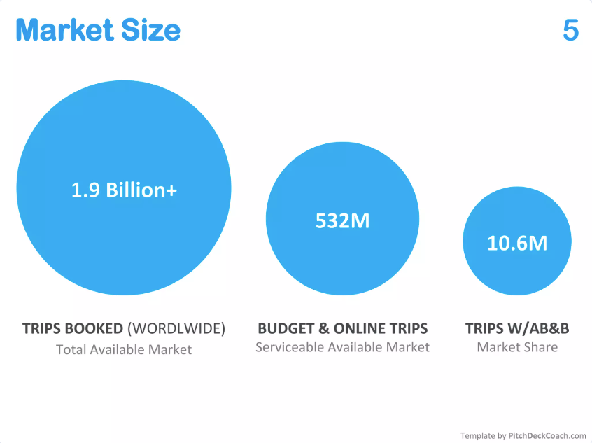 Airbnb is a personal favorite of mine. Not only am I (still) an avid Airbnb'er, I love that its founders didn't attend a top university. It's hard to glean from its pitch deck alone, but it seems that Airbnb's TAM is the total number of trips (vacation or otherwise) booked worldwide. It thought it they would be competitive in the budget and online trips category, where it would charge a transaction fee (average $20), which would put its TAM at $38Bn and their SAM at $10.6Bn. It thought it could capture 2% of that market, bringing its SOM to $212M.